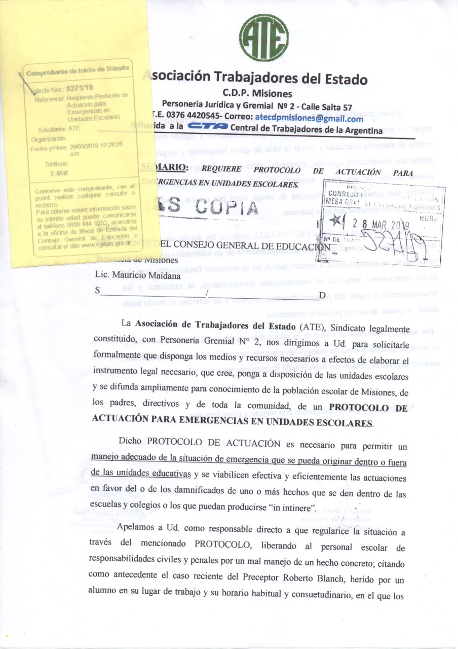 Asociación de Trabajadores del Estado (ATE Misiones) solicitó formalmente al